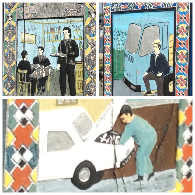 Leży tu listonosz, uginający się na malunku nagrobkowym od ciężaru listów, jest strażak w wozie strażackim, żołnierz na koniu i jakiś inny w czołgu czy wozie bojowym, traktorzysta na traktorze, górnik z kilofem przy ścianie węgla i nawet policjant w radiowozie.