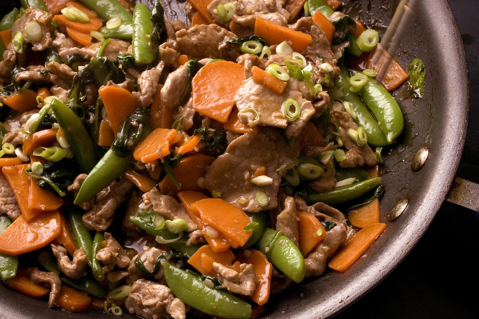 Pokrojone w cienkie paseczki warzywa lub mieso, należy smażyć w woku i podczas smażenia energicznie mieszać lub podrzucając, przesuwać składniki na patelni.