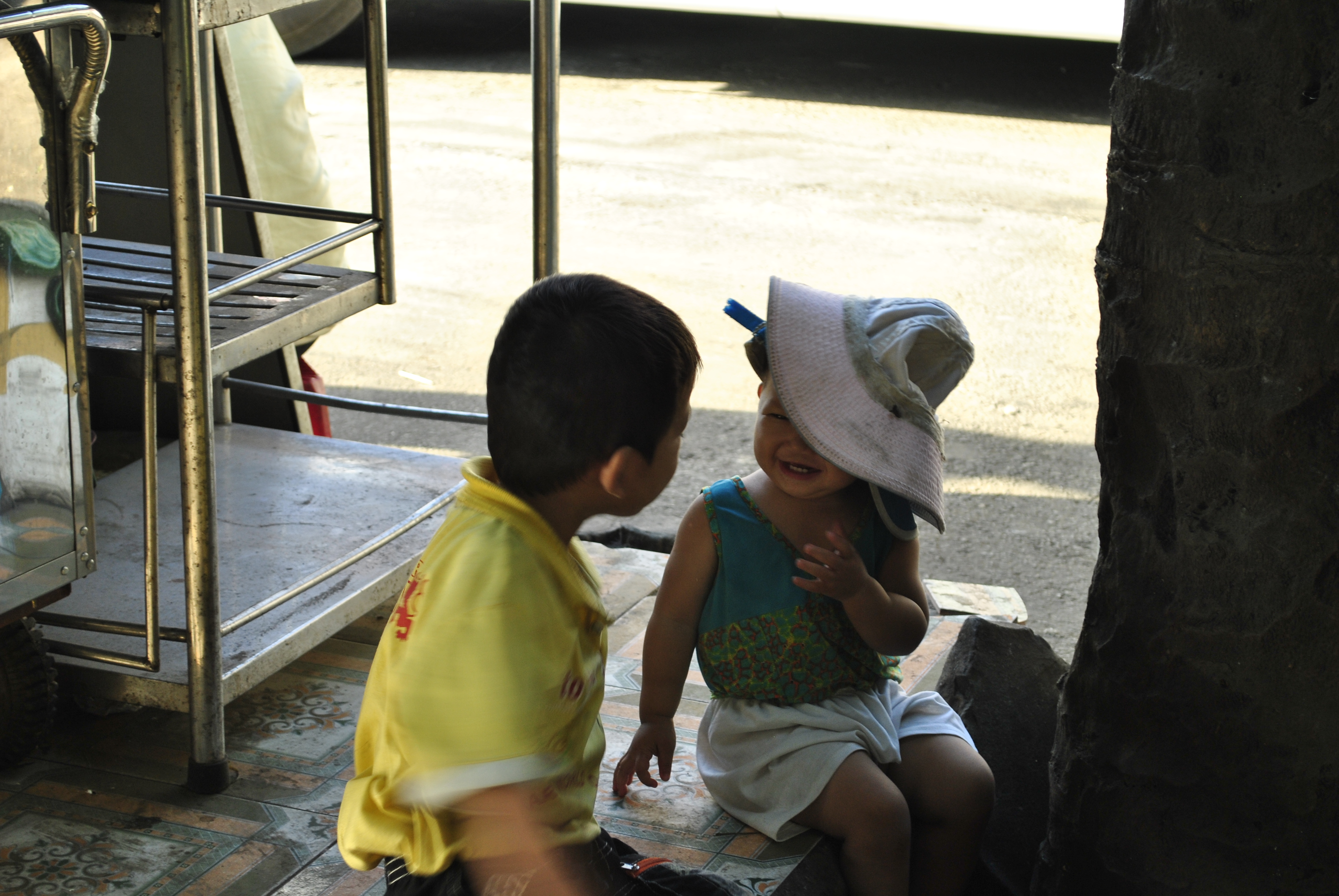 Są dzeci zabierane przez matkę gazeciarke do pracy, tj. na dworzec autobusowy. Posadzone na betonowym podeście pomiędzy straganami z jedzenem, spędzą tu pewnie cały dzień, za jedyną zabawkę mając za duży kapelusz, który zakladają to jedno, to drugie. Ściągają go sobie z głów, zakrywają twarze i pokładają się przy tym ze śmiechu.