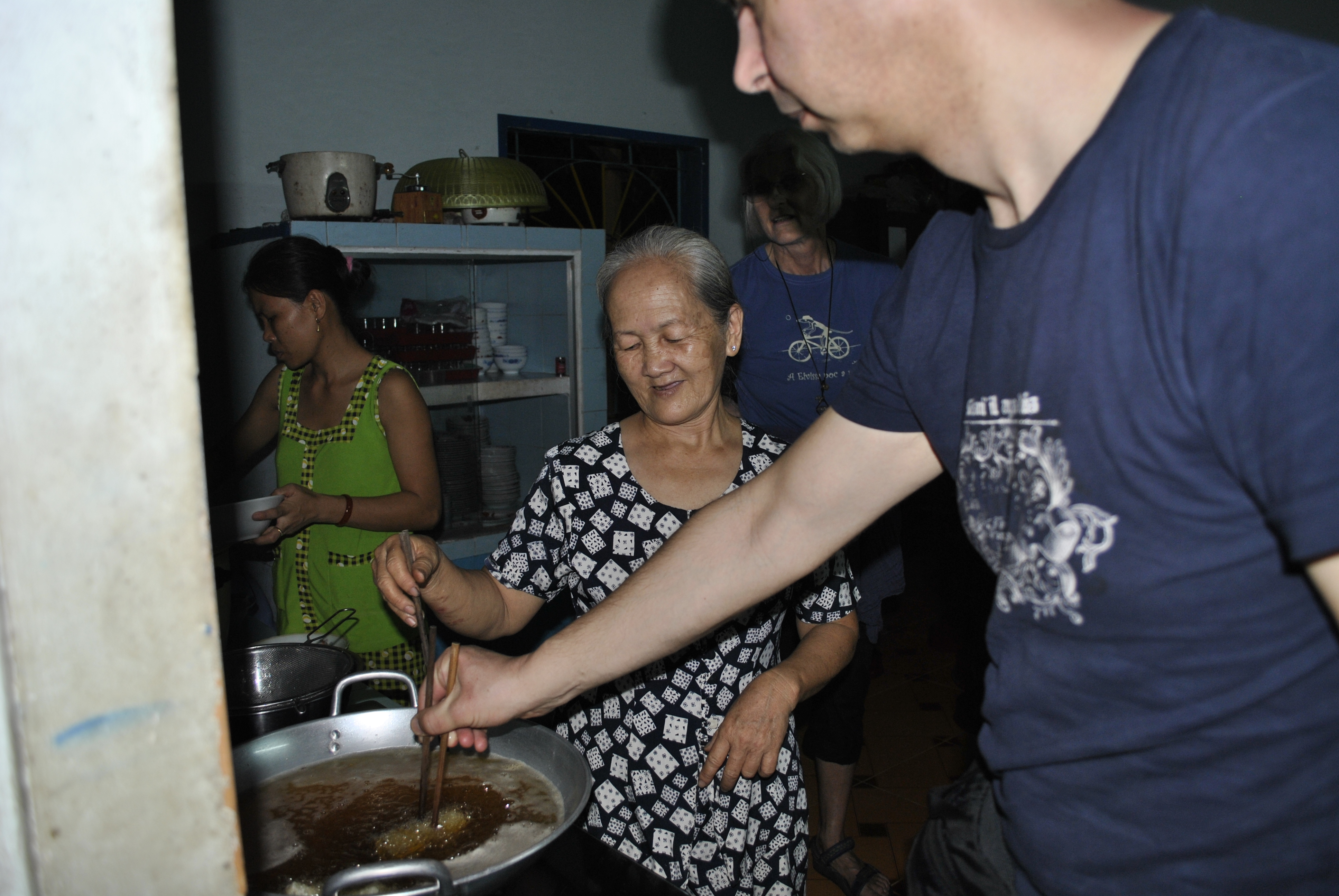 Na wieczór mieliśmy zaplanowany cooking class, wiec ledwo usiedlismy do stolu, gdy gospodarze zapędzili nas do zwijania sajgonek, które potem smażylisśmy pod okiem kobiet – matki i żony gospodarza.