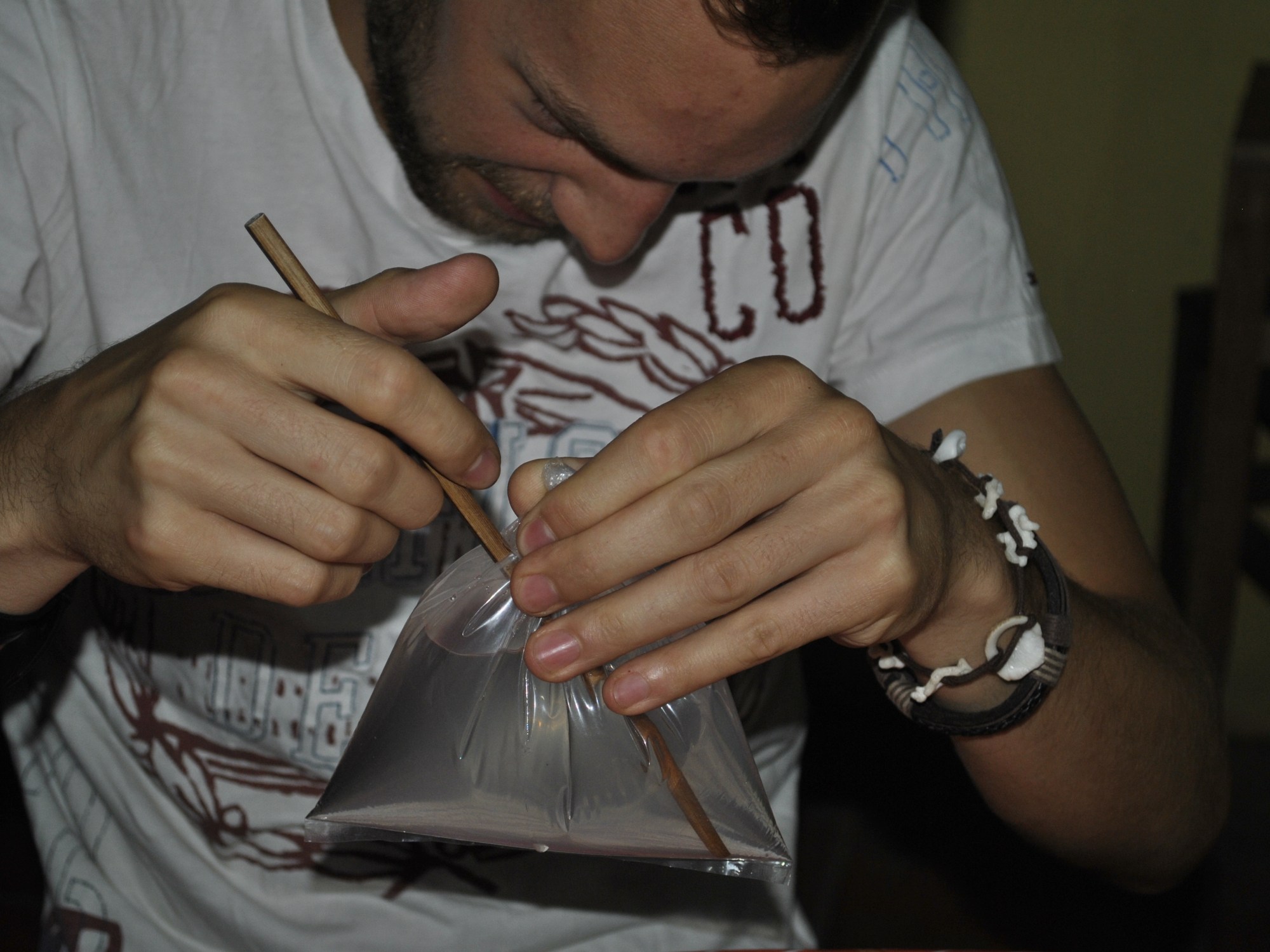 Do obslugi torebek każdy stolik dostał jednak po jednej pałeczce. Pałeczką należało przebić torebkę od góry, przeprowadzić w środku do dolnego rogu i drugi raz przebić, właśnie w dolnym rogu.